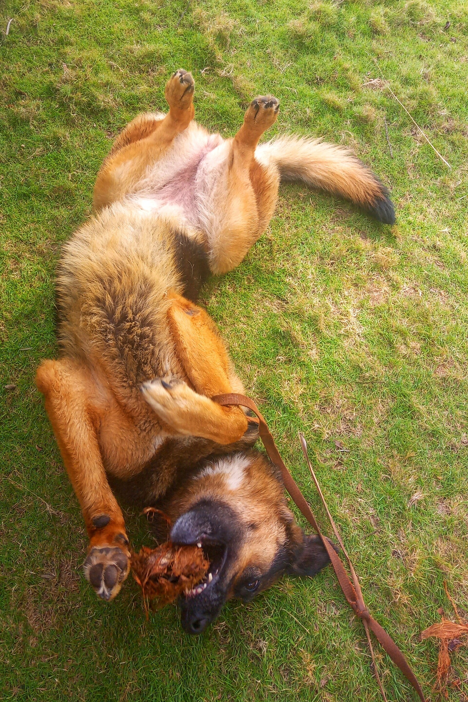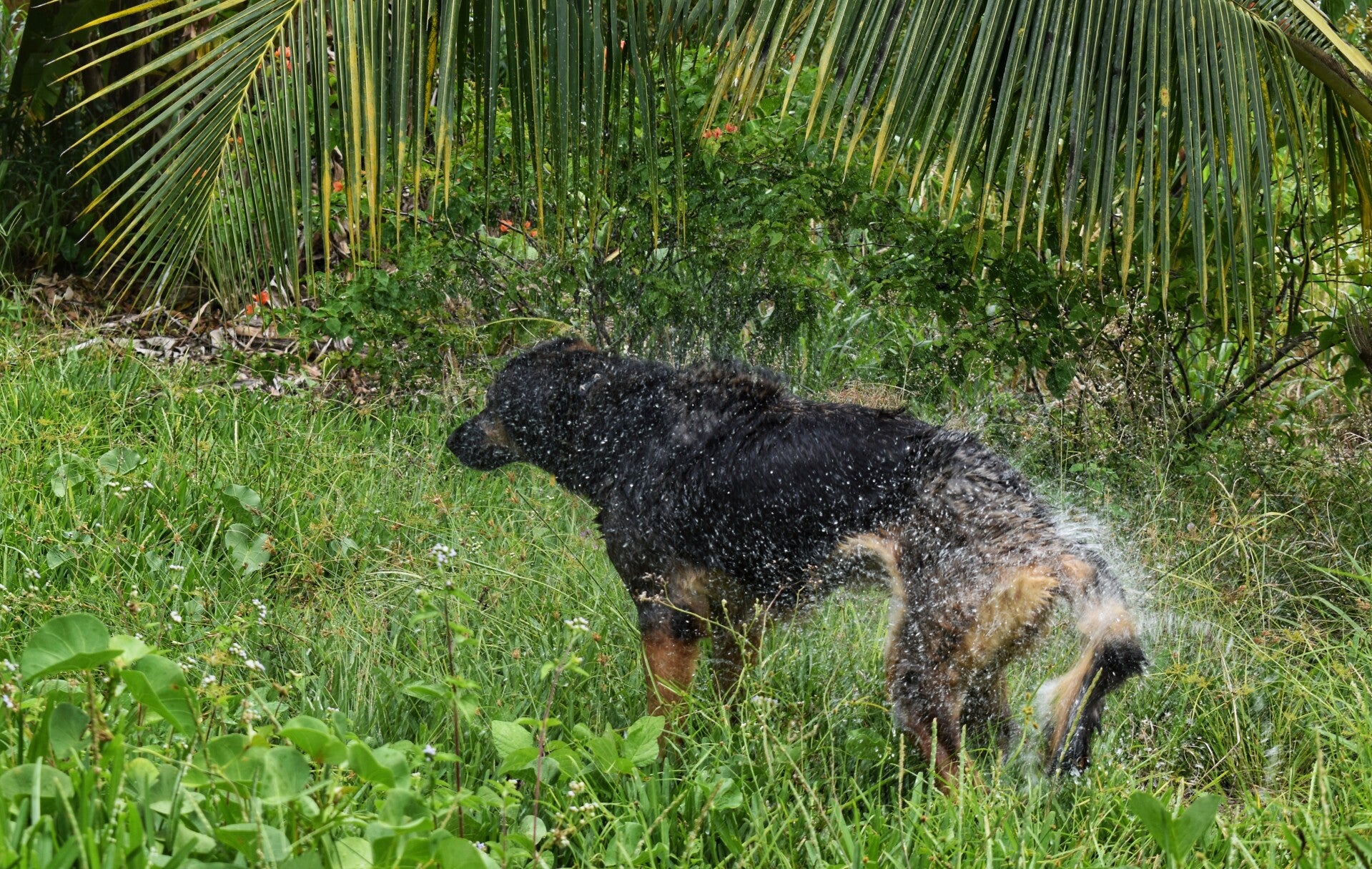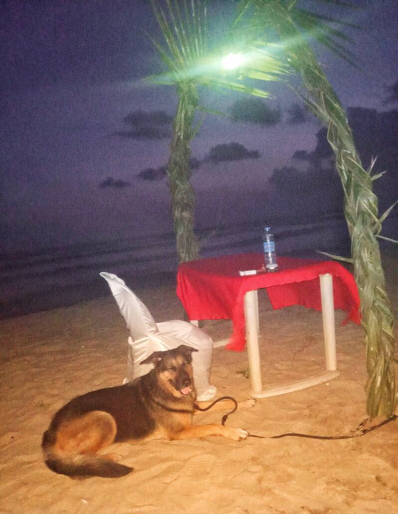 Für den Gassigang können wir uns entscheiden zwischen schattigen Palmen oder einen leeren Strand. Gibt auch Wiese hier in der sie sich ausgiebig wälzt.
