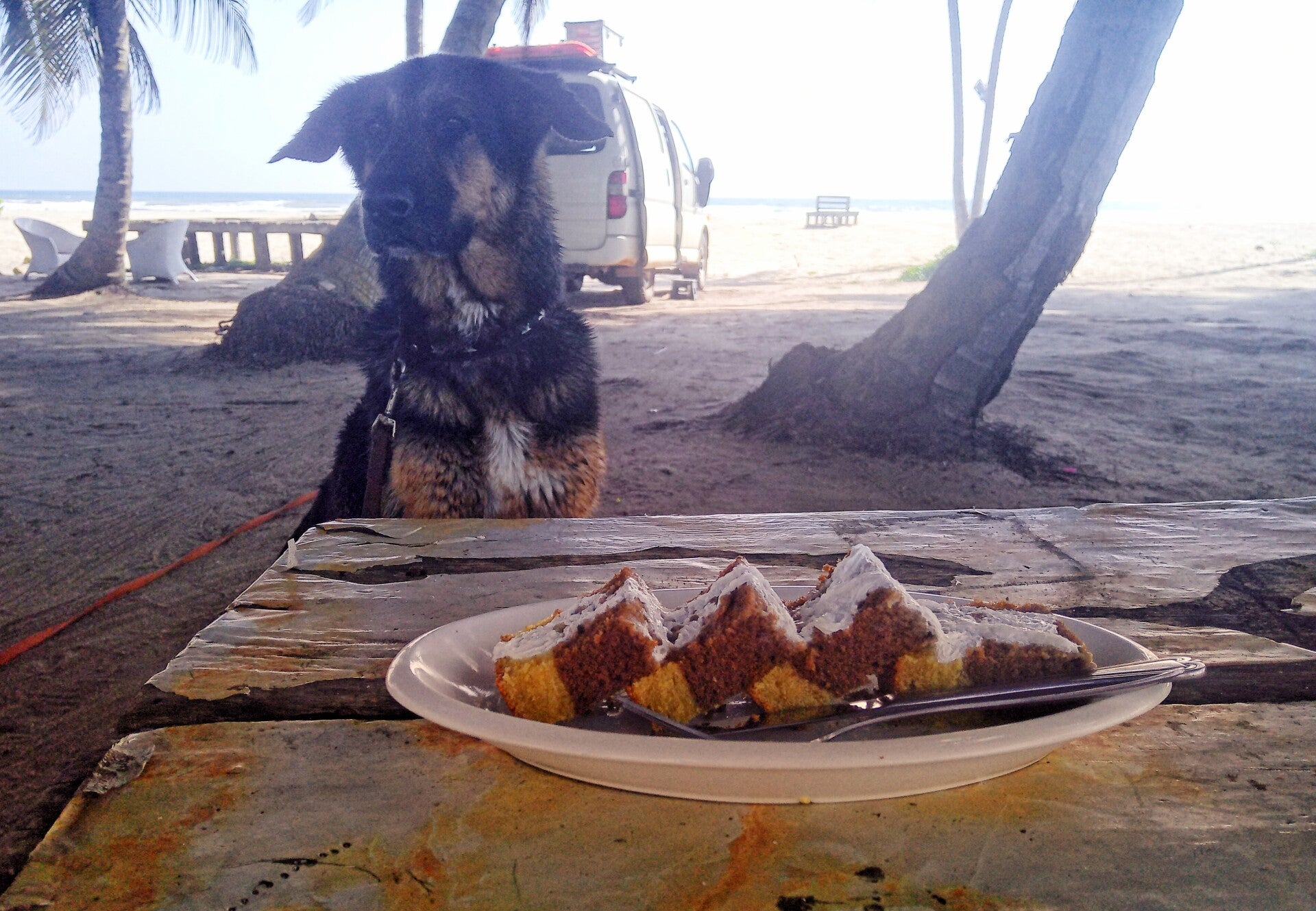 Ich habe noch nie solange am Stück reinen Strandurlaub gemacht, wäre mir sicher langweilig geworden ohne Mitzi. Ihre Wasserzeiten strukturieren meinen Tagesablauf. Stehe so um 8 Uhr auf, nach ihrem Morgengassi gibt’s Kaffee bis 9. Dann kommt der Morgenschwumm mit dem Tier bis es um 10 Frühstück gibt. Leiste ich mir täglich, für knapp 3 Euro gibt’s Kräuteromlett mit gedünstem Gemüse oder Salat mit Toast und Obst. Seit ich mir zu Weihnachten Kuchen gewünscht habe gibt’s seitdem noch Kuchen dazu.