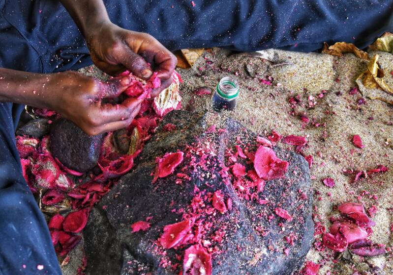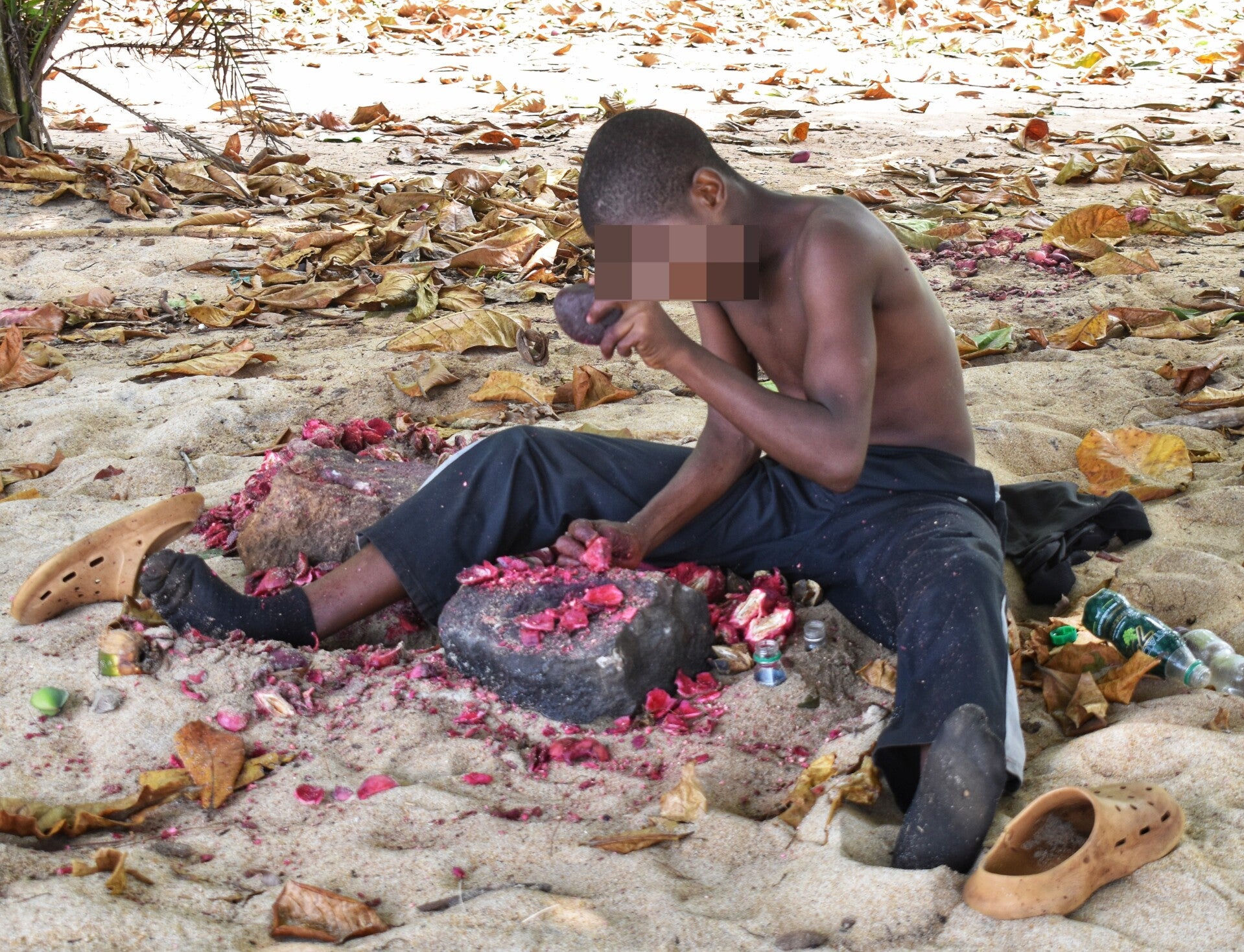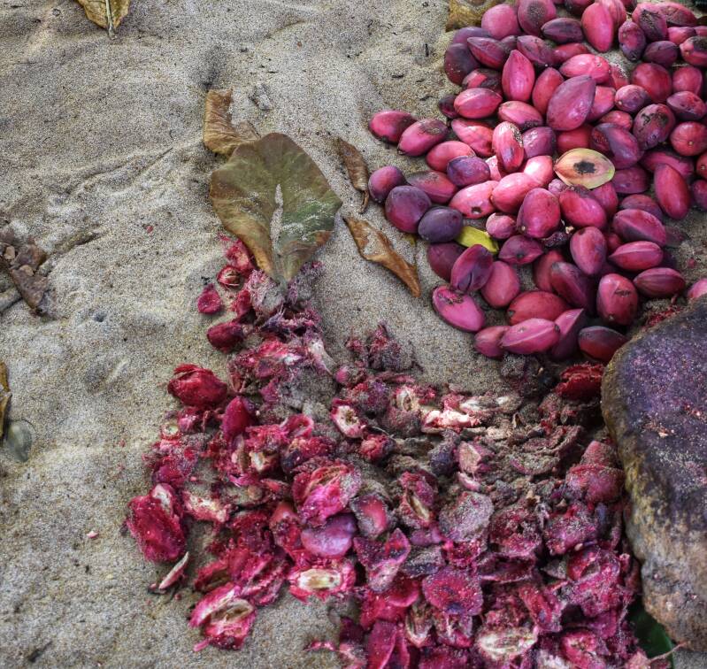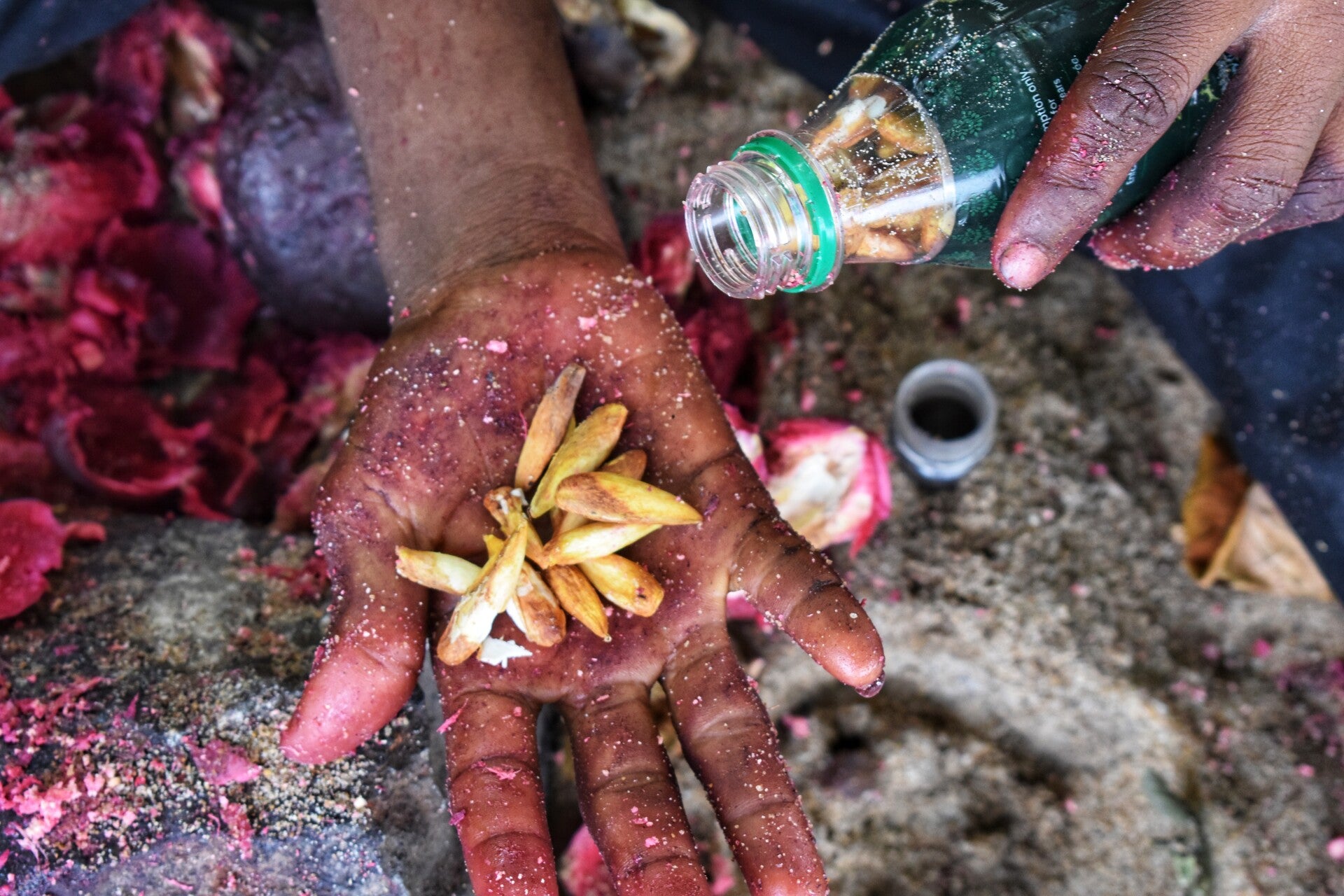 Der Junge sitzt täglich ein paar Meter hinter mir und klopft die Früchte auf. Nachdem er die Samen mühsam rausgepult hat werden sie zum Verkauf in einer Flasche gesammelt.
