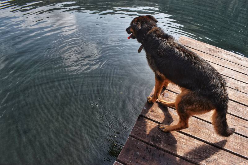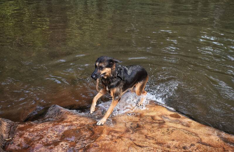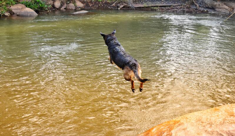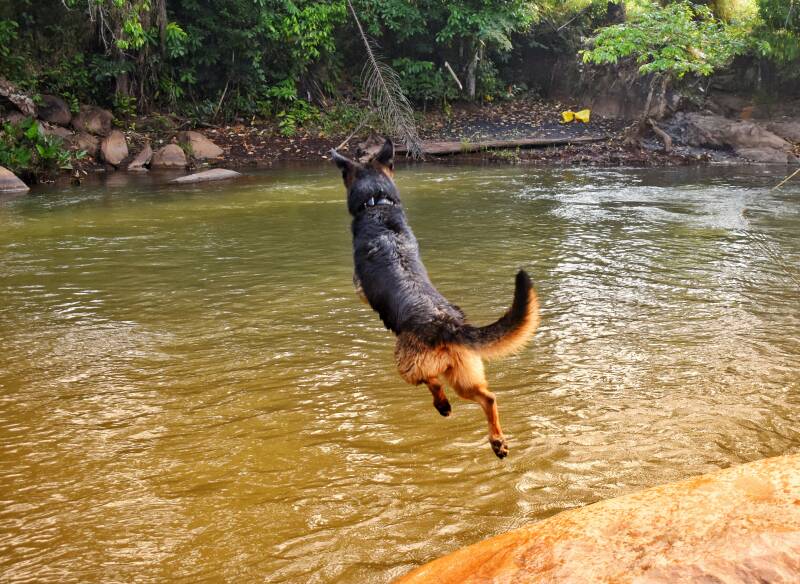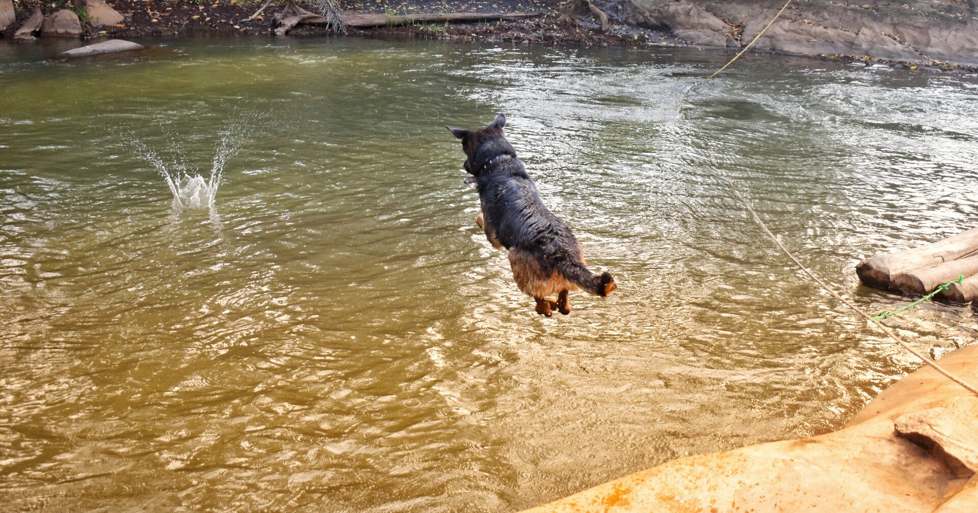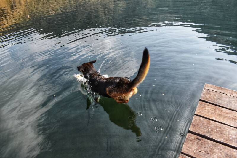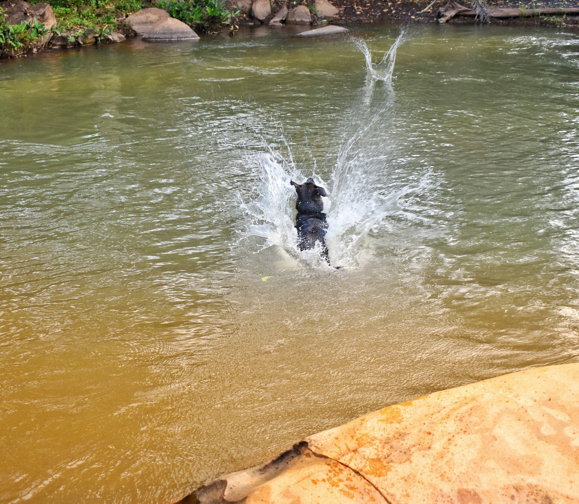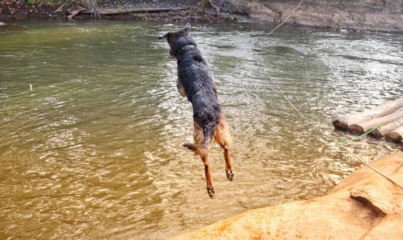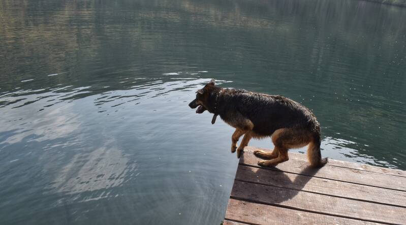 Gibt dort auch ein kleines Holzpodest zum rein springen. Mitzi ist schon von verschiedenen Erhöhungen ins Wasser gesprungen aber irgendetwas verunsichert sie.