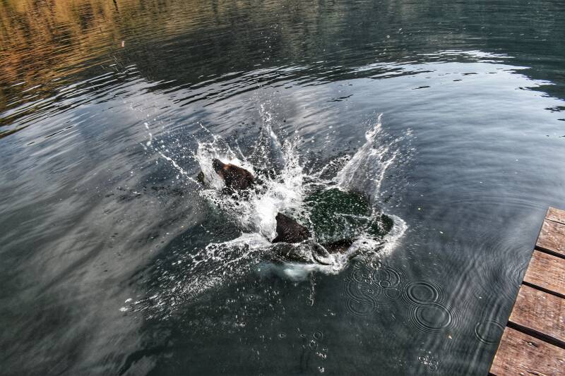 Bevor ich noch unten bin ist das Tier schon im Wasser.