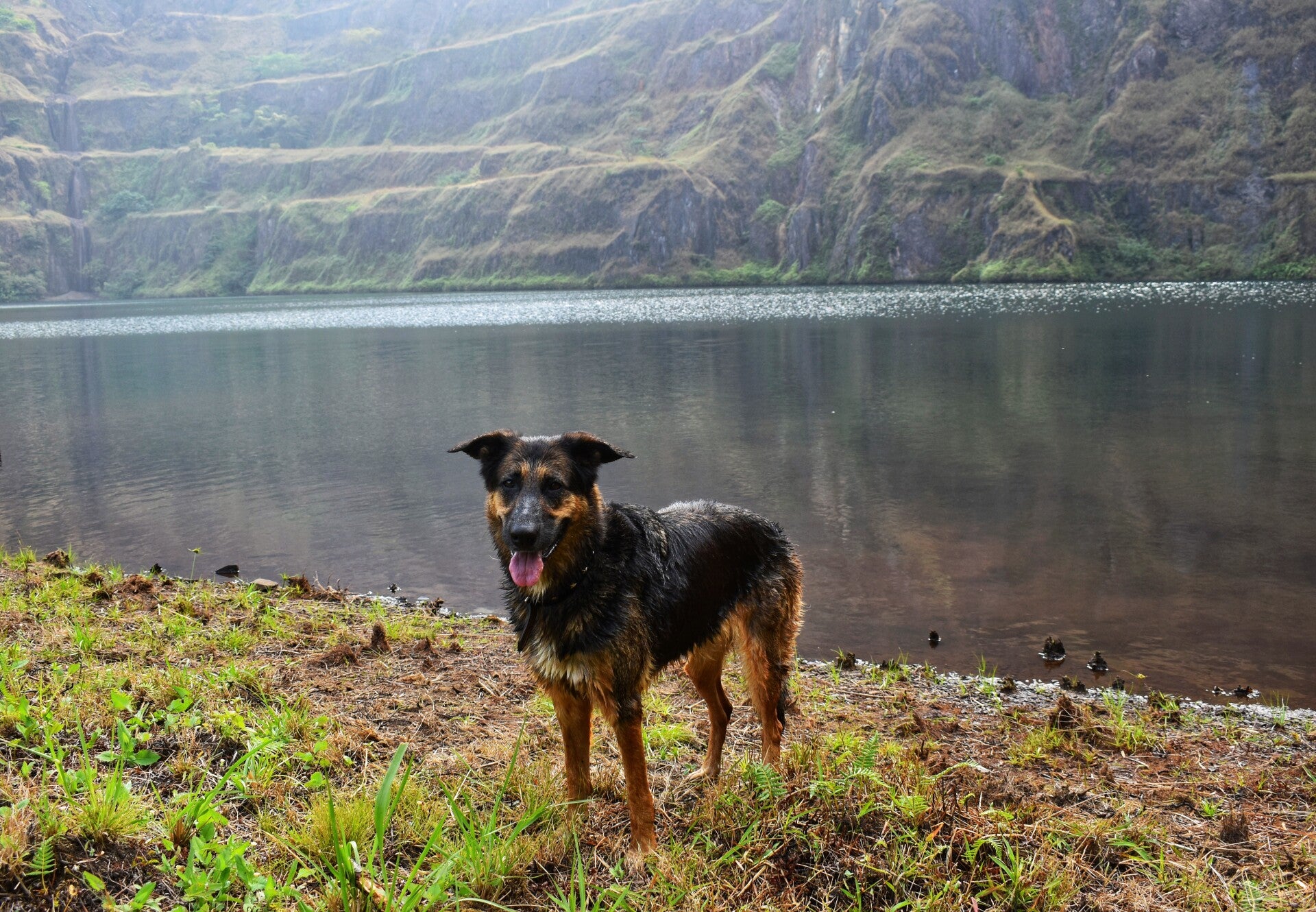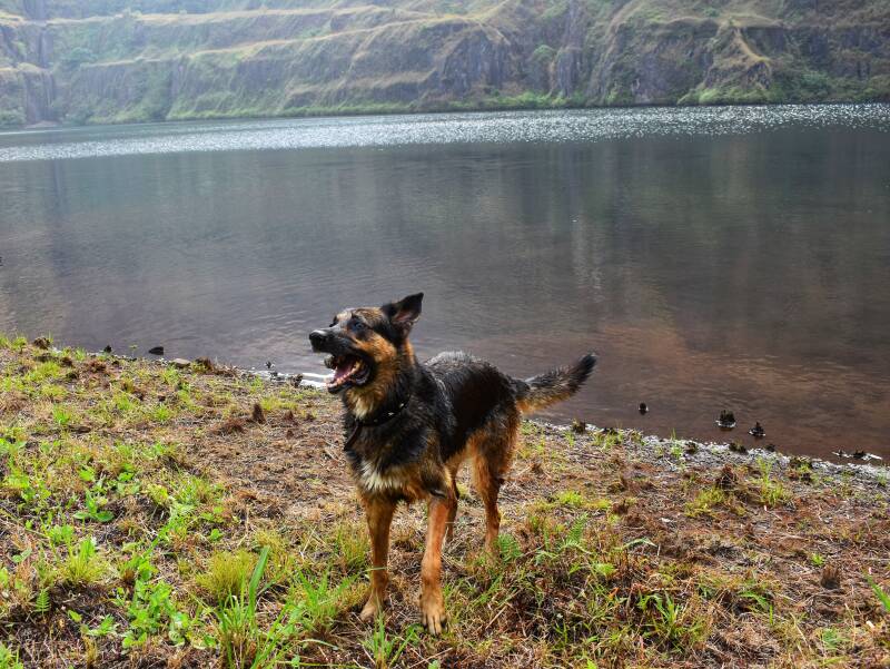 Dann kraxeln wir an einer Stelle wo ich mich am Gebüsch festhalten kann runter zum Wasser. Während ich vermutlich etwas unbeholfen aussehe springt Mitzi super elegant und sicher runter, nix alte Dame.
