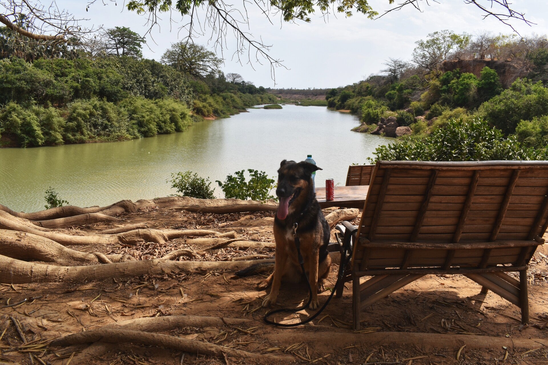 Der Stellplatz ist ein Stück weg von der Straße, direkt am Casamance Fluss. Der Gummi der Heckscheiben ist eigentlich schwarz, das Rot ist die Farbe Guineas. Dieser feine Staub hat sich auch innen überall festgesetzt.